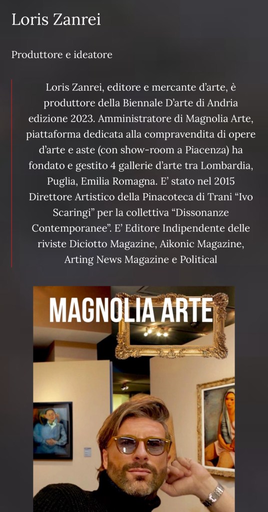 Nel 2018 fonda Magnolia Arte, casa d’aste e piattaforma dedita alla vendita di opere d’arte e collezioni moderne e contemporanee e antiche. Dal 2022 e’ ideatore e produttore della Biennale d’arte di Andria in Puglia, nel prestigioso Museo Diocesano “San Riccardo”.