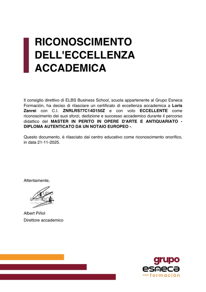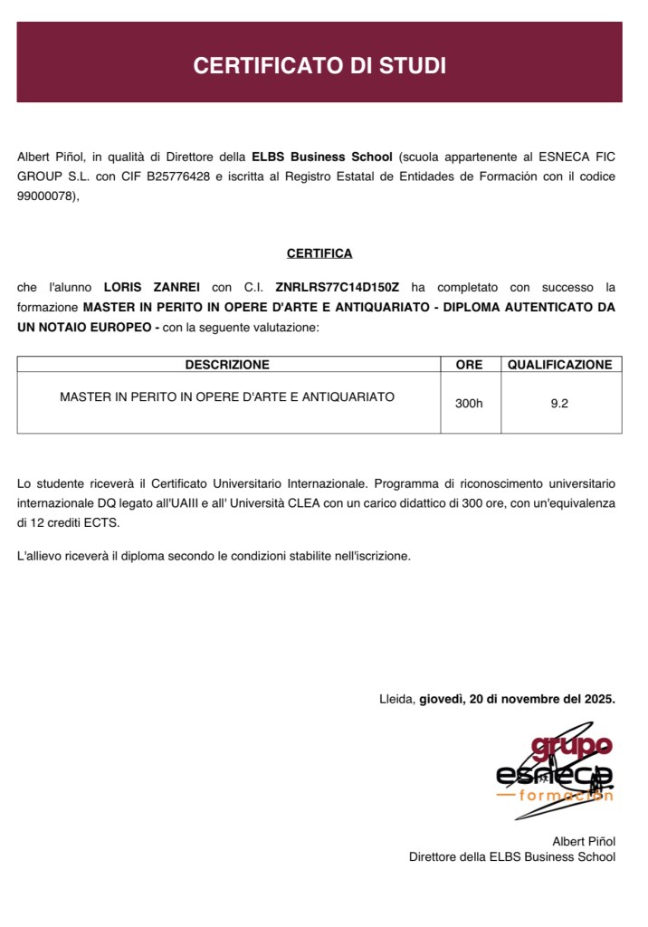 PERITO IN OPERE D’ARTE E ANTIQUARIATO, CON DIPLOMA AUTENTICATO DA NOTAIO EUROPEO (2025) Certificato Universitario Internazionale –